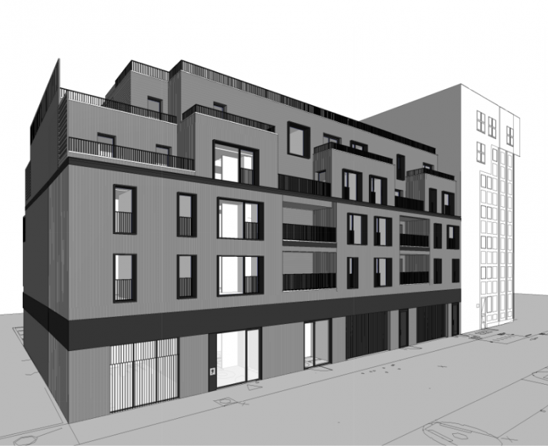 Le projet prévoit la construction d’un immeuble de 11 logements en R+4 en surélévation d’un parking béton armé existant en rez-de-chaussée avec un niveau de sous-sol.