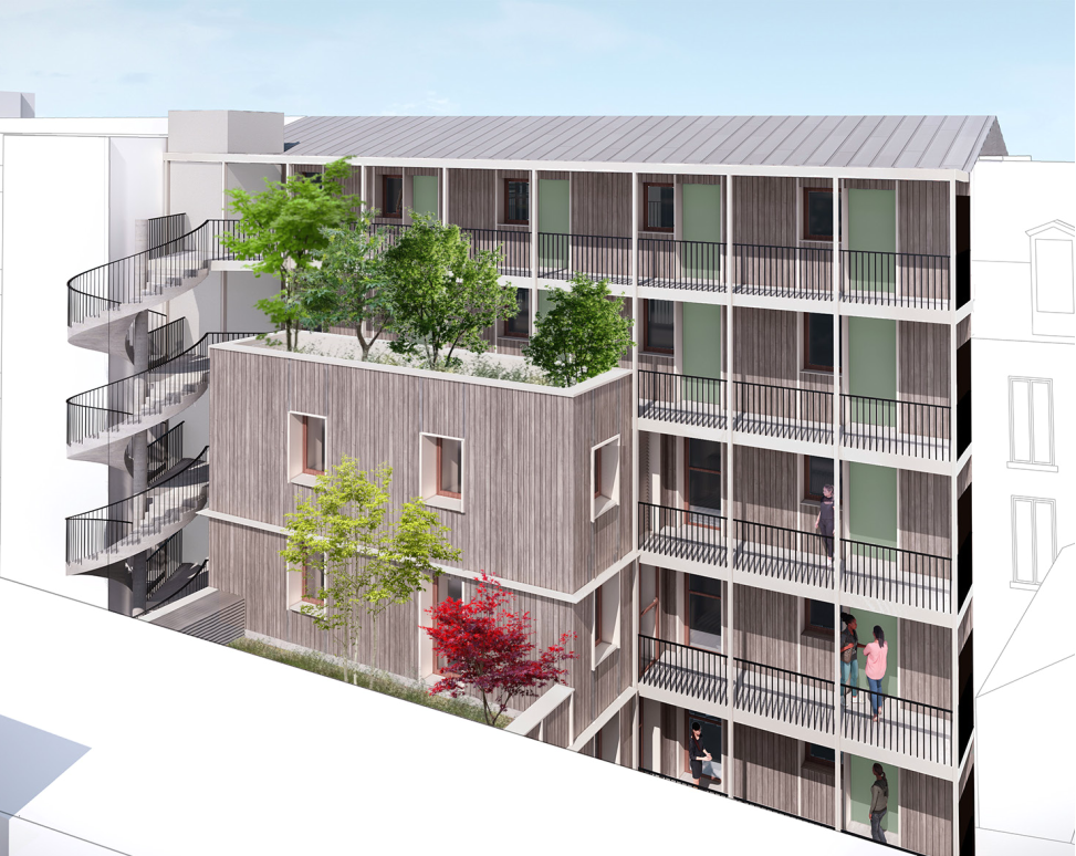 L’opération porte sur la démolition complète du bâtiment existant et la construction neuve d’un nouveau bâtiment de 7 étages. Ce nouveau bâtiment accueillera un CSAPA avec 30 places de dortoir et 5 chambres de stabilisation ainsi que des appartements ACT sur les deux derniers étages.