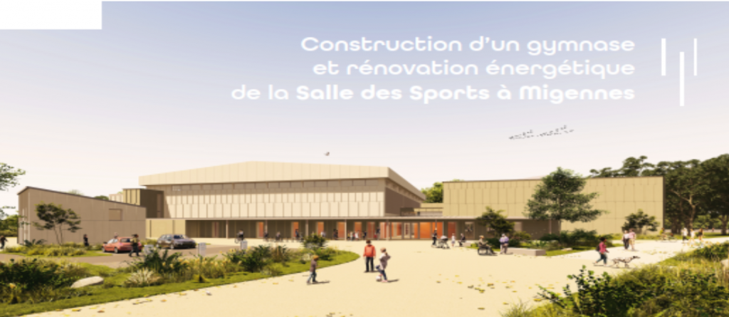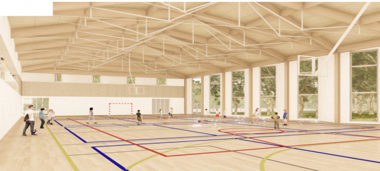 L’opération est double entre la réhabilitation thermique d’un gymnase existant en charpente métal / élévations béton et la construction d’un second gymnase en bois paille.